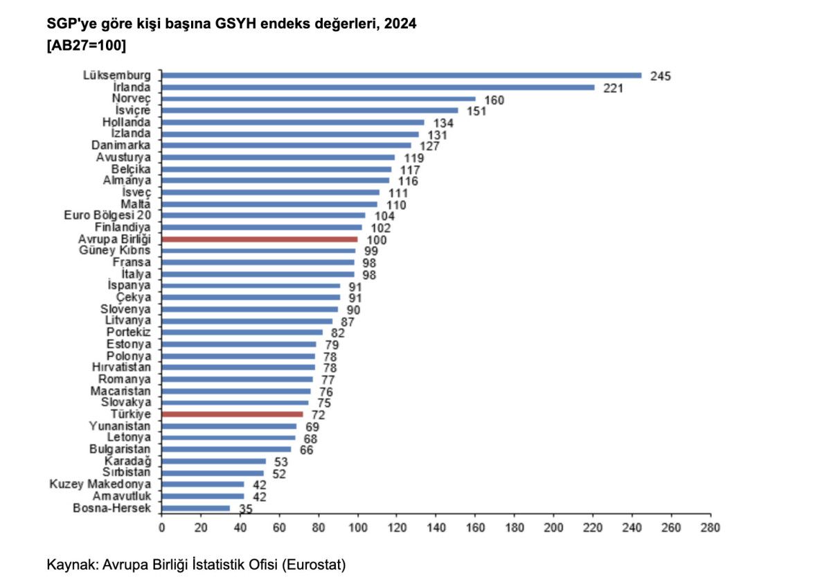 Avrupa Birliği İstatistik Ofisi (Eurostat) tarafından ilan SGP’ye göre kişi başına GSYH endeks değeri, 27 Avrupa Birliği (AB) ülkesi için ortalama 100 birim iken Türkiye için 72 birim oldu ve AB ortalamasının yüzde 28 altında kaldı.