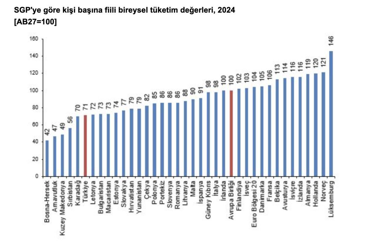 Kişi başına fiili bireysel tüketim düzeyi 27 AB ülkesi ortalaması 100 iken Türkiye için 71 oldu ve AB ortalamasının yüzde 29 altında kaldı. Karşılaştırmalarda yer alan 36 ülke arasında kişi başına fiili bireysel tüketim değeri en yüksek ülke 146 ile Lüksemburg, en düşük ülke ise 42 ile Bosna-Hersek olarak kayıtlara geçti