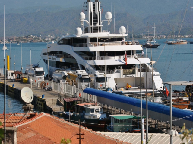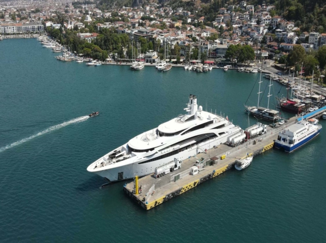 Fethiye İskelesi’ne yanaşan 4 bin 437 grostonluk yata karadan İzmir Aliağa’dan getirilen 450 bin litre yakıt ikmali yapıldı. Forbes’un milyarderler listesine de giren iş insanı Alijan Ibragimov’un eşi Mukadaskhan Ibragimov ile çocuklarının içinde bulunduğu yatın Muğla’nın Bodrum ilçesine sonra Fethiye geldiği öğrenildi.