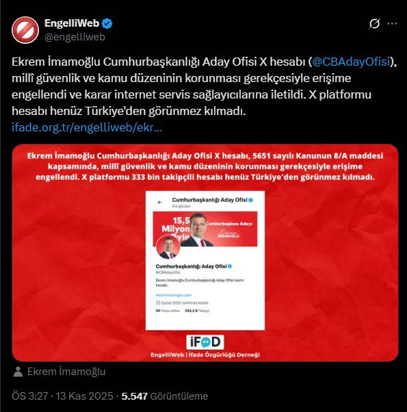 İmamoğlu’nun erişim engeli kararının ardından paylaşımlarını sürdürdüğü ‘Ekrem İmamoğlu Cumhurbaşkanlığı Aday Ofisi’ X hesabı da millî güvenlik ve kamu düzeninin korunması gerekçesiyle erişime engellendi.